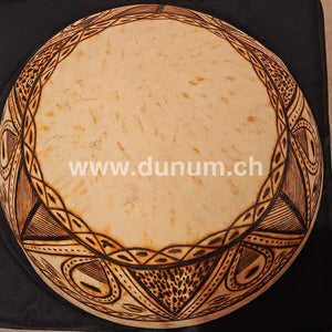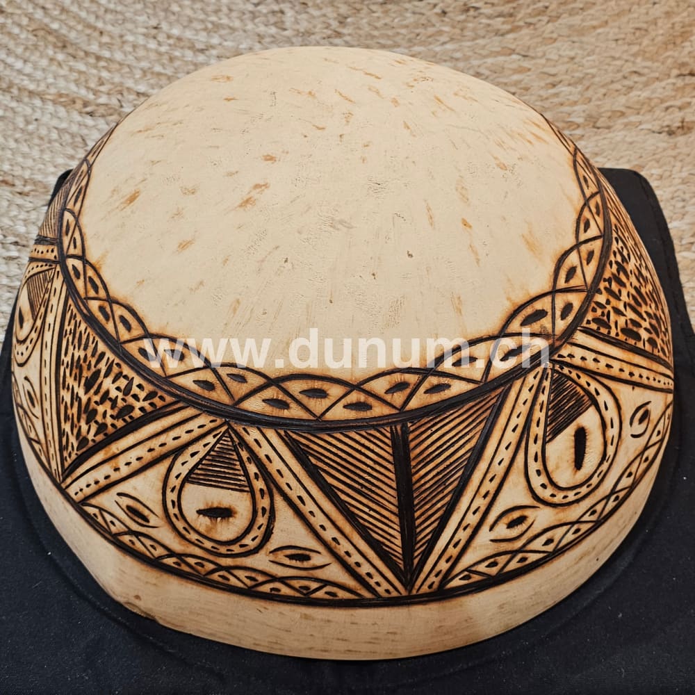 Diese Kalebasse aus Niger ist besonders dick. Es hält wiederholten Schlägen allein mit der Hand, mit einem Ring oder Stab stand. Der Rand ist flach, damit sie im aufgestellten Zustand sehr stabil ist und um den besten Klang zu erzielt.