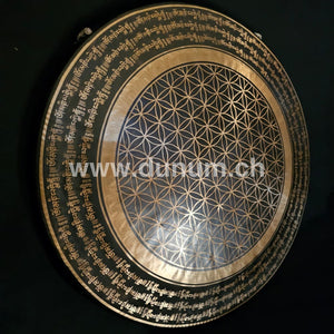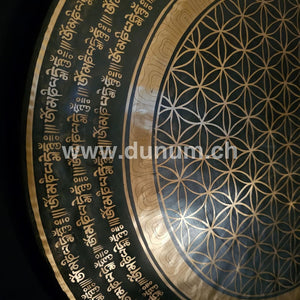 Wunderschön gravierter Gong aus Nepal mit der Blume des Lebens und dem tibetanischen Mantra Om Mane Padme Hum.