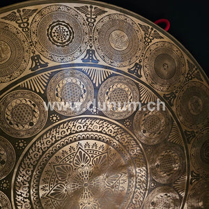 Wunderschön gravierter Gong aus Nepal. Im Zentrum eine wunderschöne Lotus Blume, umringt von Blumen des Lebens mit den Mondphasen umrundet. Um äusseren Ring die 8 Glücksverheissenden Buddhistischen Symbolen mit den Chakra Symbole, Om und Sri Yatra gemischt.