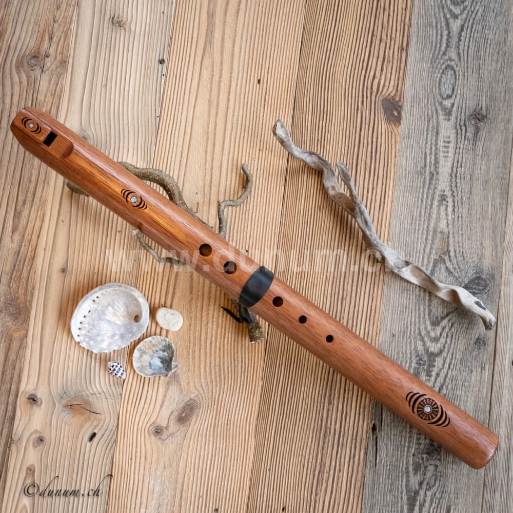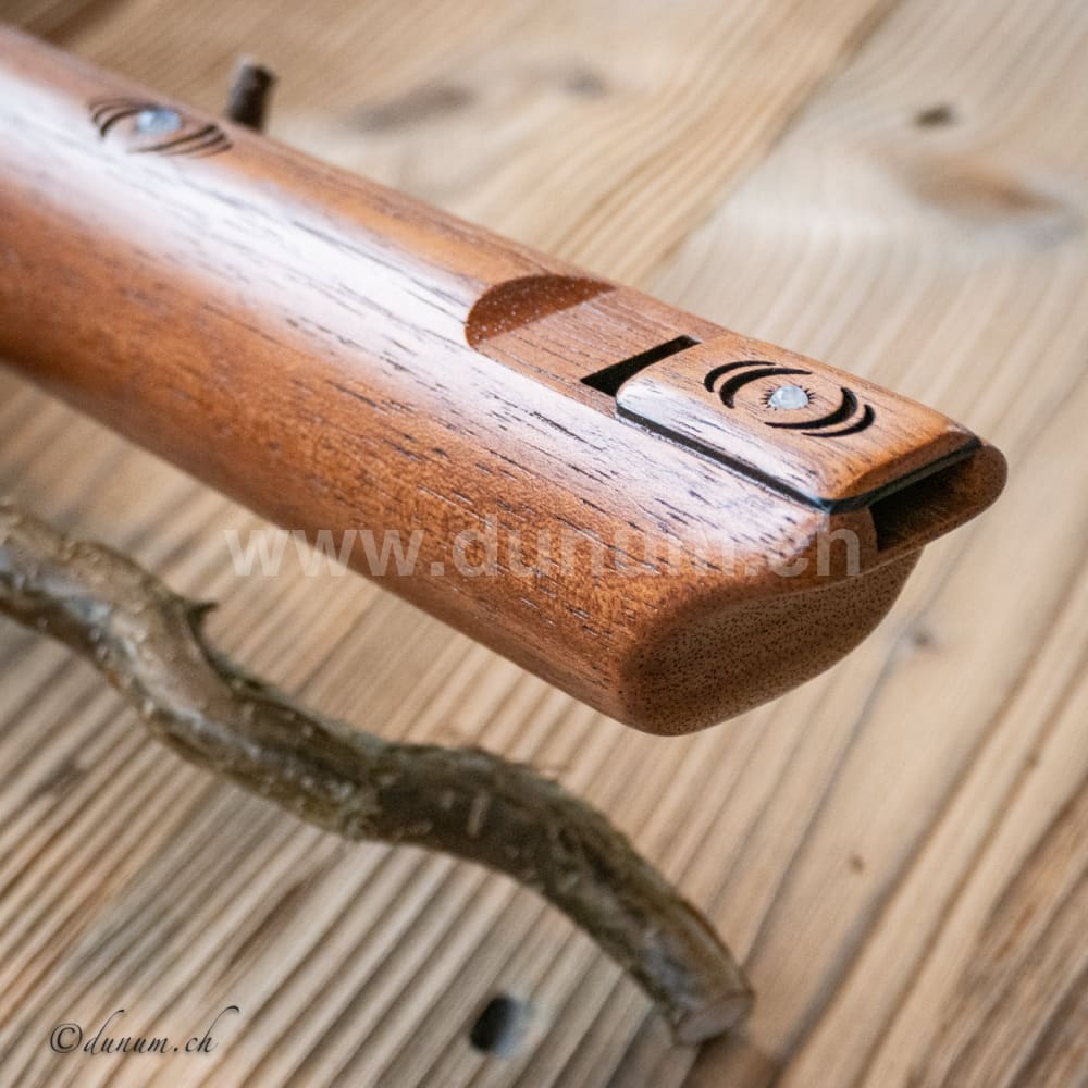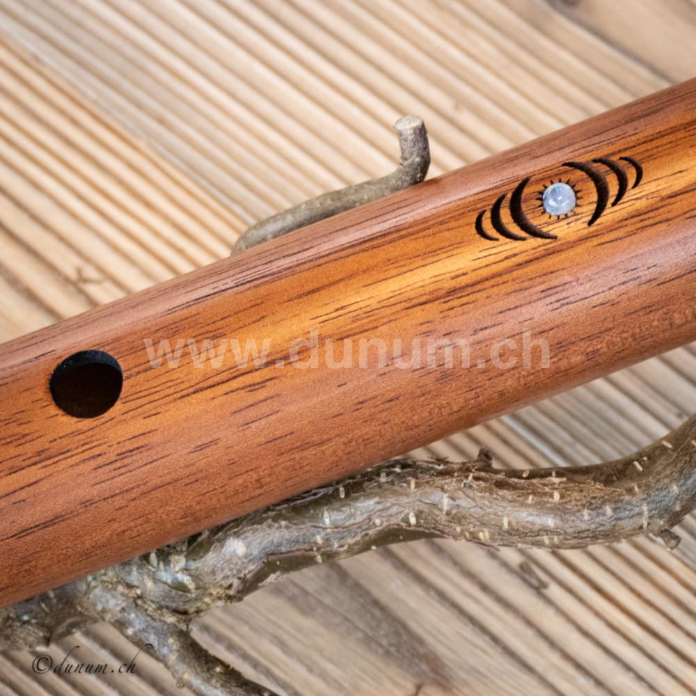 Das Inlay enthält Rainbow Moonstone-Cabochons mit Gravur, die das geometrische Muster der 432-Hz-Frequenz bei Vibration in Sand darstellt. High Spirit Flöten sind mit ungiftigen Ölen versiegelt, was ihnen eine warme, resonante und volle Stimme verleiht.