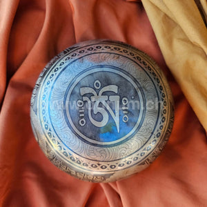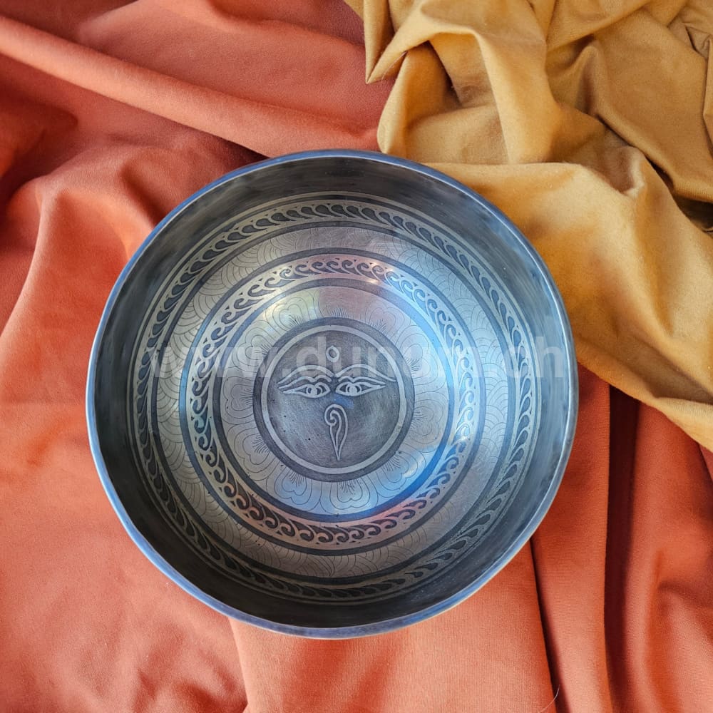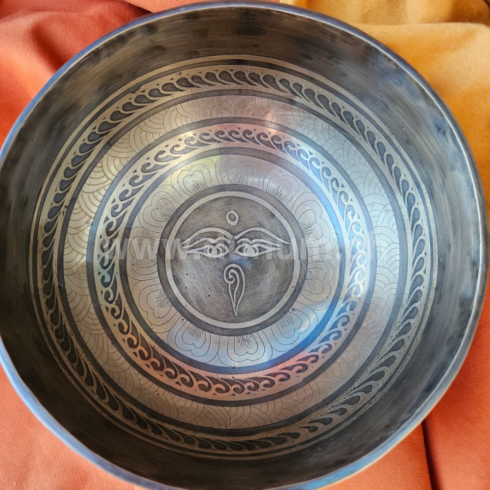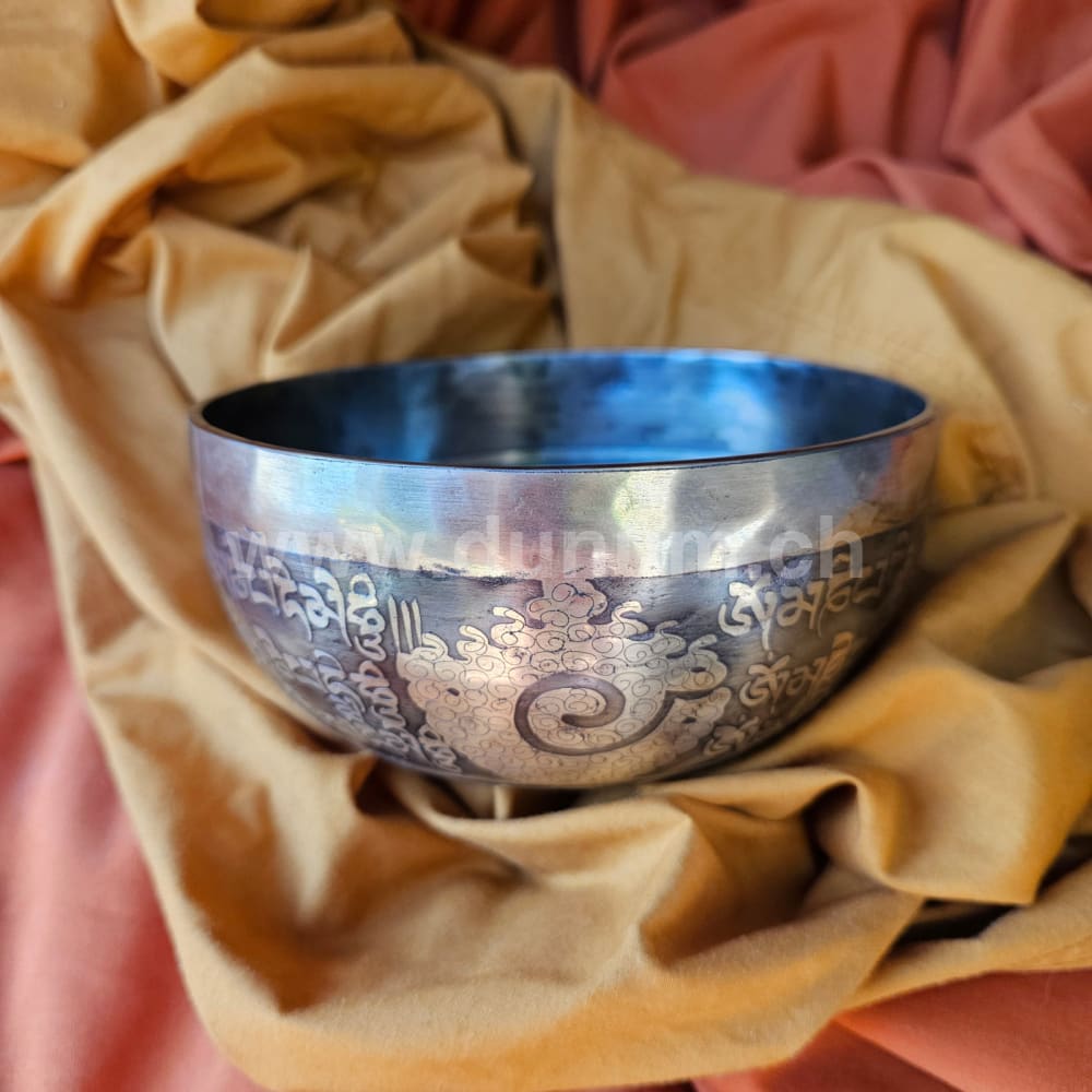 Klangschale mit kunstvollem Muster, im Zentrum die Augen des Buddhas, Aussenwand mit Mantras verziert und unten das Om in Sanskrit.