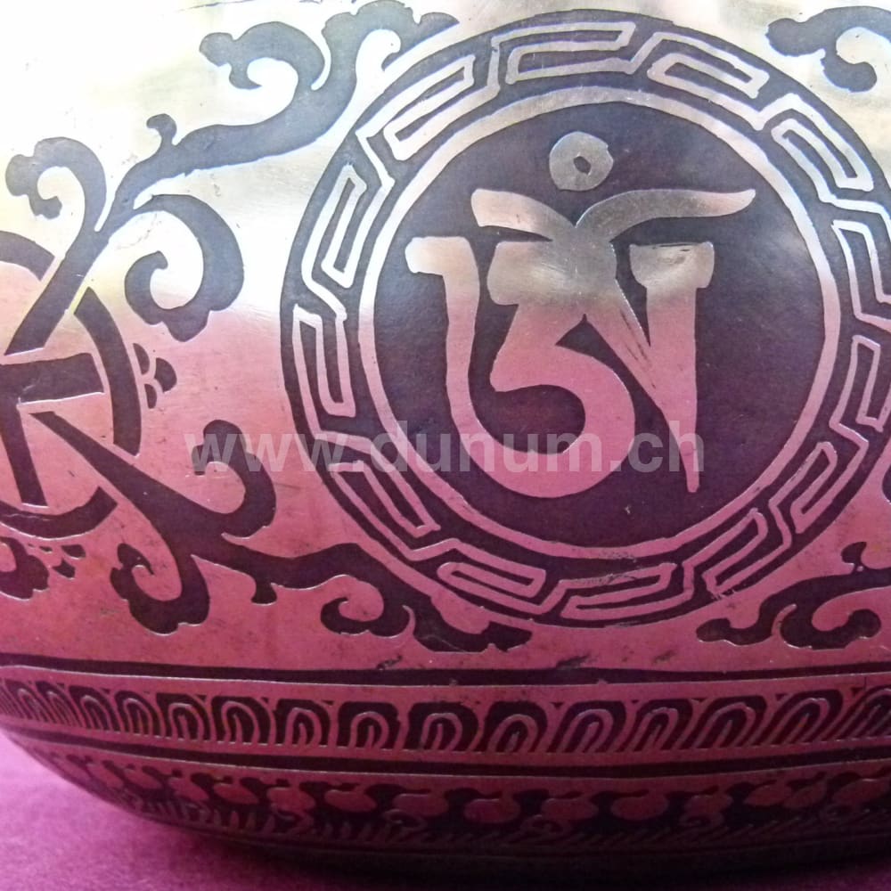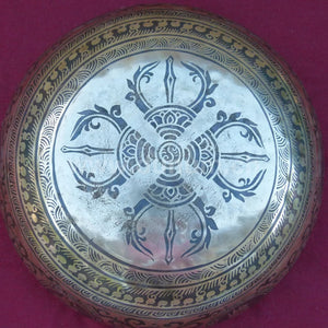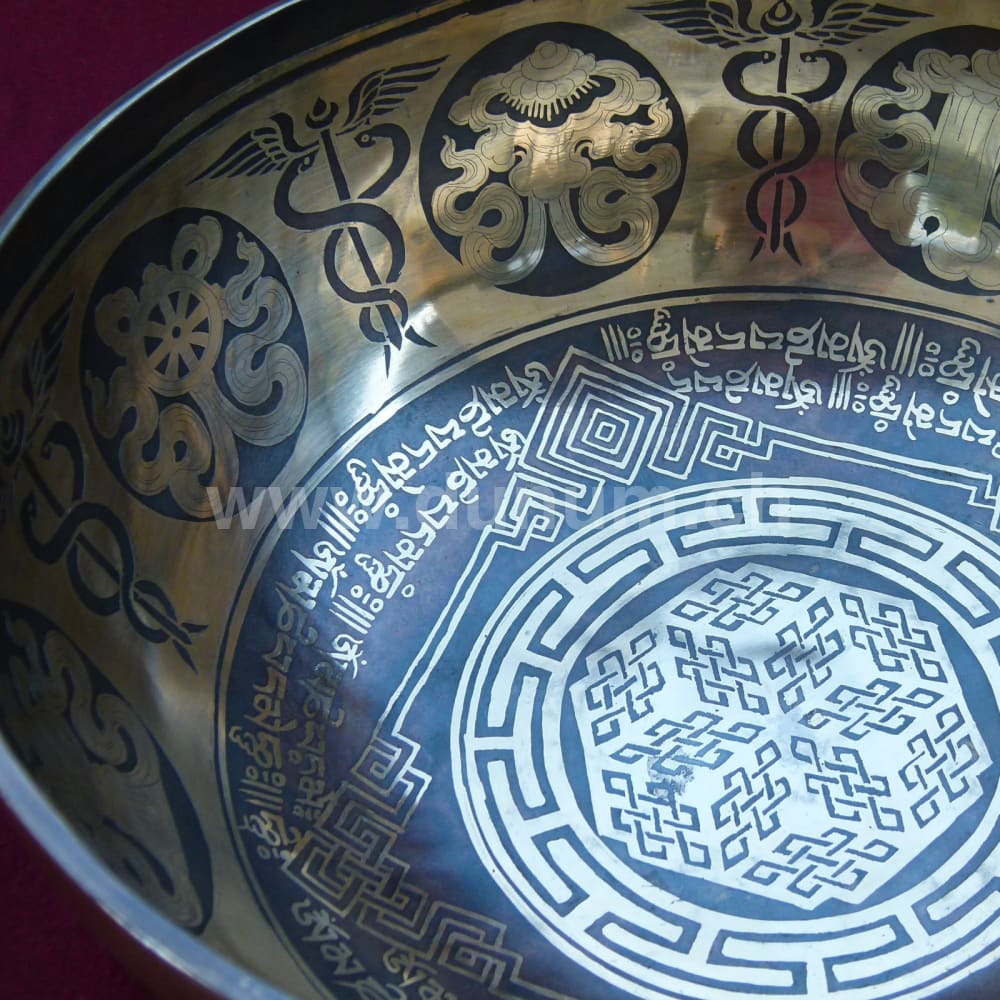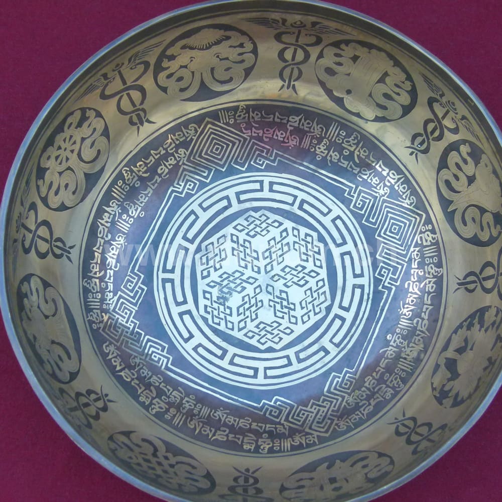 Klangschale mit geometrischem Muster des endlosen Knotens im Zentrum, umkreist von buddhistischen Mantras (Gebete) und den acht glücksverheissenden Buddhistischen Symbolen un der Medizin Schlangen.