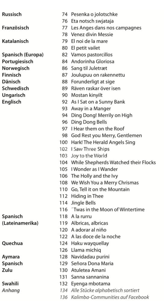 "Weihnachtslieder aus aller Welt" ist eine Liedersammlung, die den Kalimbaspieler dazu einlädt, sich auf eine musikalische Weltreise zu begeben, ohne die Europäische Herkunft aus dem Auge zu verlieren.