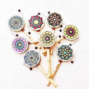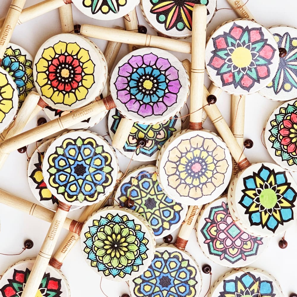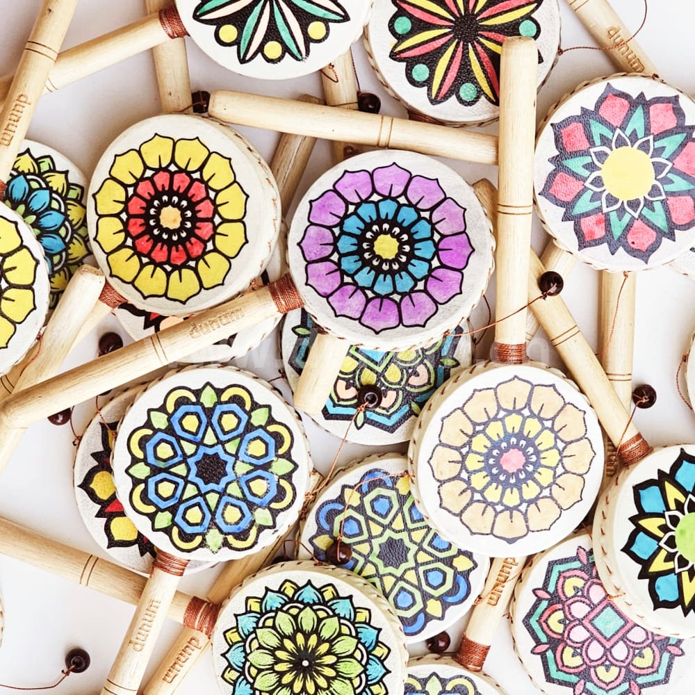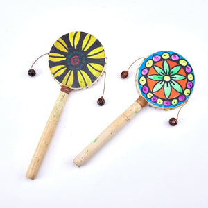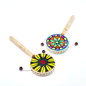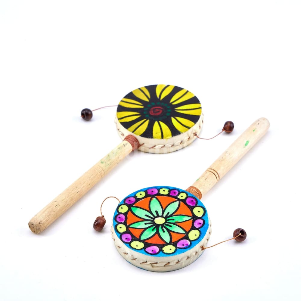 Überall in der Welt kommt diese Trommelform vor. Halte die Damasa an seinem Holzgriff fest, aus deinem Handgelenk schwingst du die Trommel von links nach rechts.