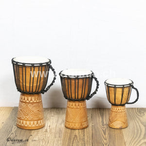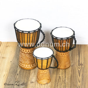 Diese Djembe ist ein kleines Modell für Kinder. Es lässt sich seitlich unter dem Arm, spielen oder zwischen den Beinen eingeklemmt.