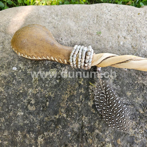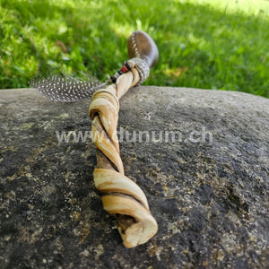 Schamanenrassel aus Bisonhaut mit Bergkristall und Muschelstücken gefüllt, auf Efeu Stab.