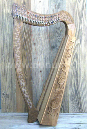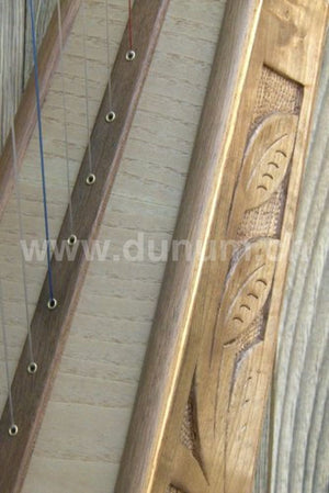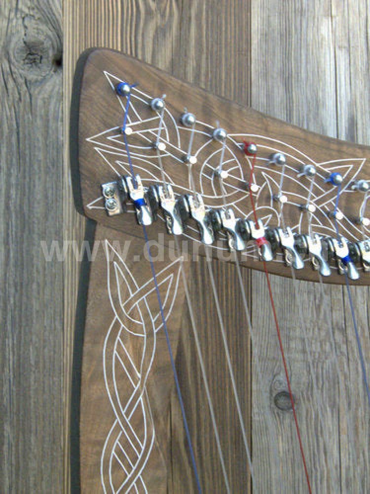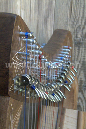 Keltische Harfe mit 19 Nylonsaiten, Stimmbereich: F6 bis C3. Die C-Saiten sind rot, die F-Saiten blau. Jede Saite hat Halbtonklappen, so dass die Harfe leicht eine halbe Note höher gestimmt werden kann. Gute Harfe für Studenten oder auch als Reise Harfe.