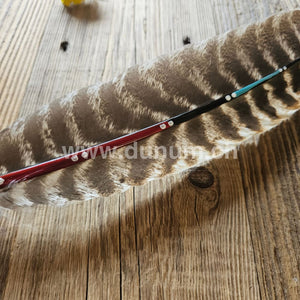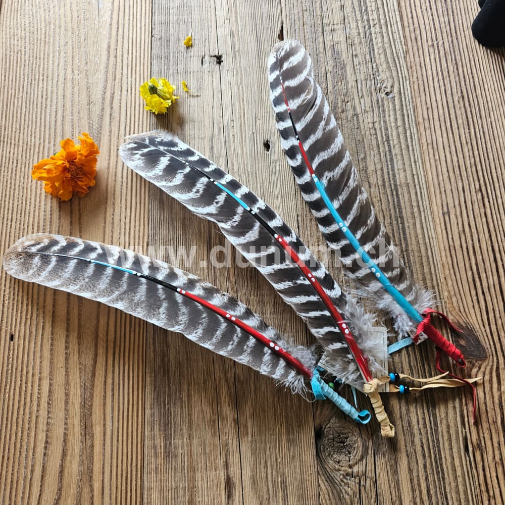 Diese Gebetsfeder wurde von Hand von einem Navajo-Künstler gefertigt. Der mit Leder umwickelte Schaft trägt die Handschrift seines Weges, seines heiligen Pfades. Jede Feder aus Truthahn, jede Perle und jedes Stück Leder ist einzigartig und von der Natur geformt – so gleicht keine Gebetsfeder der anderen.