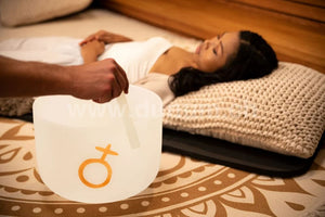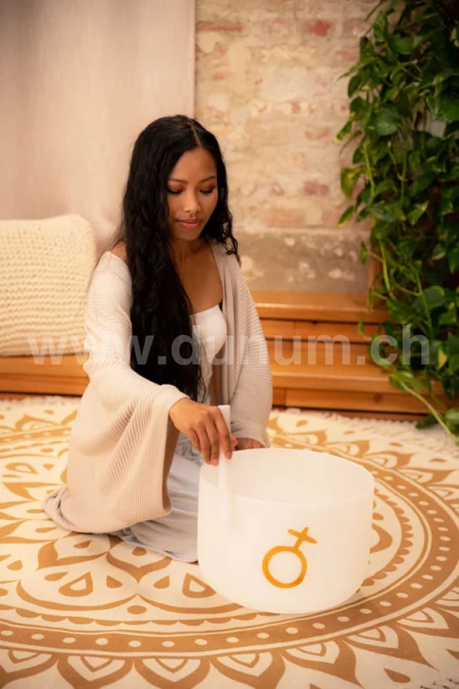 The white-matt planetary crystal singing bowls are manufactured according to the calculations of Hans Cousto (The Cosmic Octave) and correspond to the frequencies of the sun, moon and planets. Each bowl is tuned to produce the corresponding frequency of the celestial body.