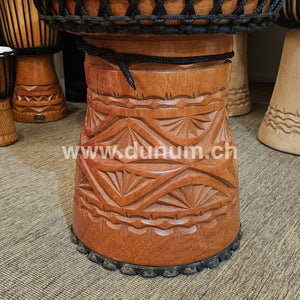 TOP Djembé from Guinea. Made of high-quality, hand-crafted wooden body from a single hardwood trunk, artfully decorated by hand down to the smallest detail .