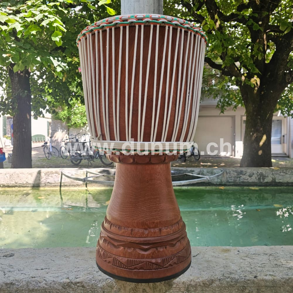 Master class djembé from Guinea. Made of high-quality, hand-crafted wooden body from a single hardwood trunk, artfully decorated by hand down to the smallest detail .
