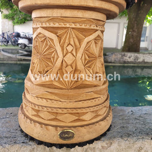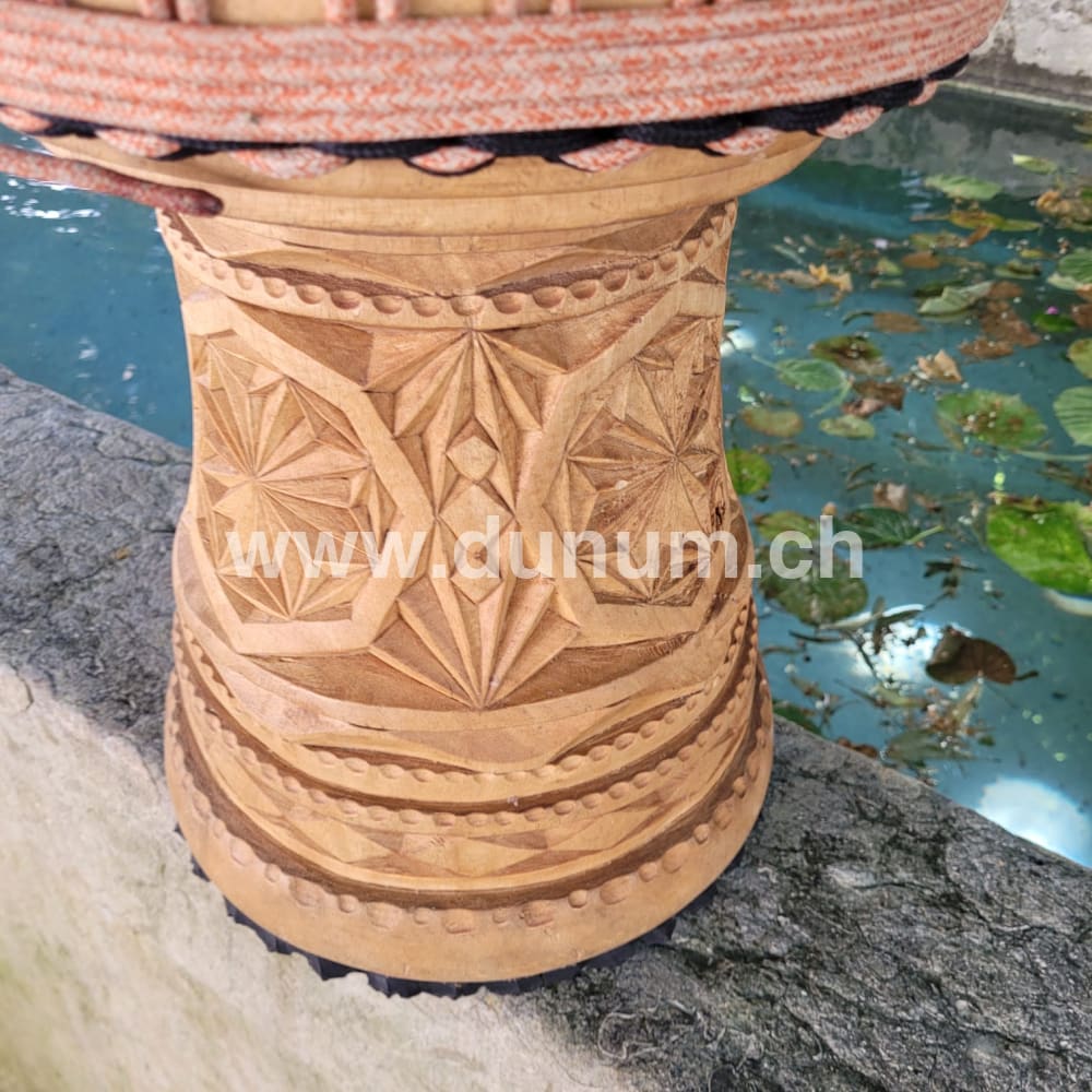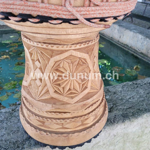 Master class djembé from Guinea. Made of high-quality, hand-crafted wooden body from a single hardwood trunk, artfully decorated by hand down to the smallest detail .