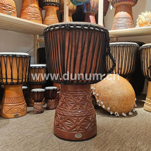 TOP Djembé from Guinea. Made of high-quality, hand-crafted wooden body from a single hardwood trunk, artfully decorated by hand down to the smallest detail .