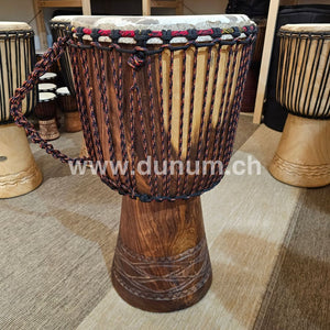Professional djembé from Mali, West Africa. Made of high-quality, hand-crafted wooden body from a single hardwood trunk, artfully decorated by hand