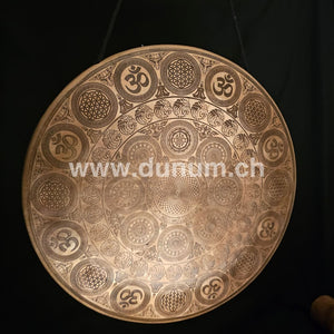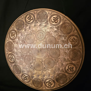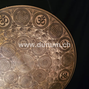 Beautifully engraved gong from Nepal with the flower of life in the center, framed by chakra symbols and other Om and flower of life motifs.