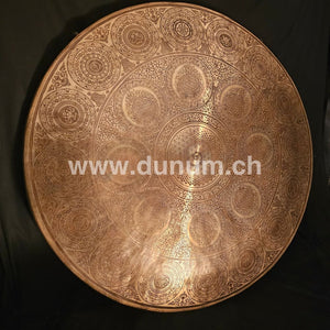 Beautifully engraved gong from Nepal with an intertwining spiral and flower-of-life motifs in the center, encircled by another circle with flower-of-life symbols and alternating Ashtamangala and chakra symbols in the outer ring.