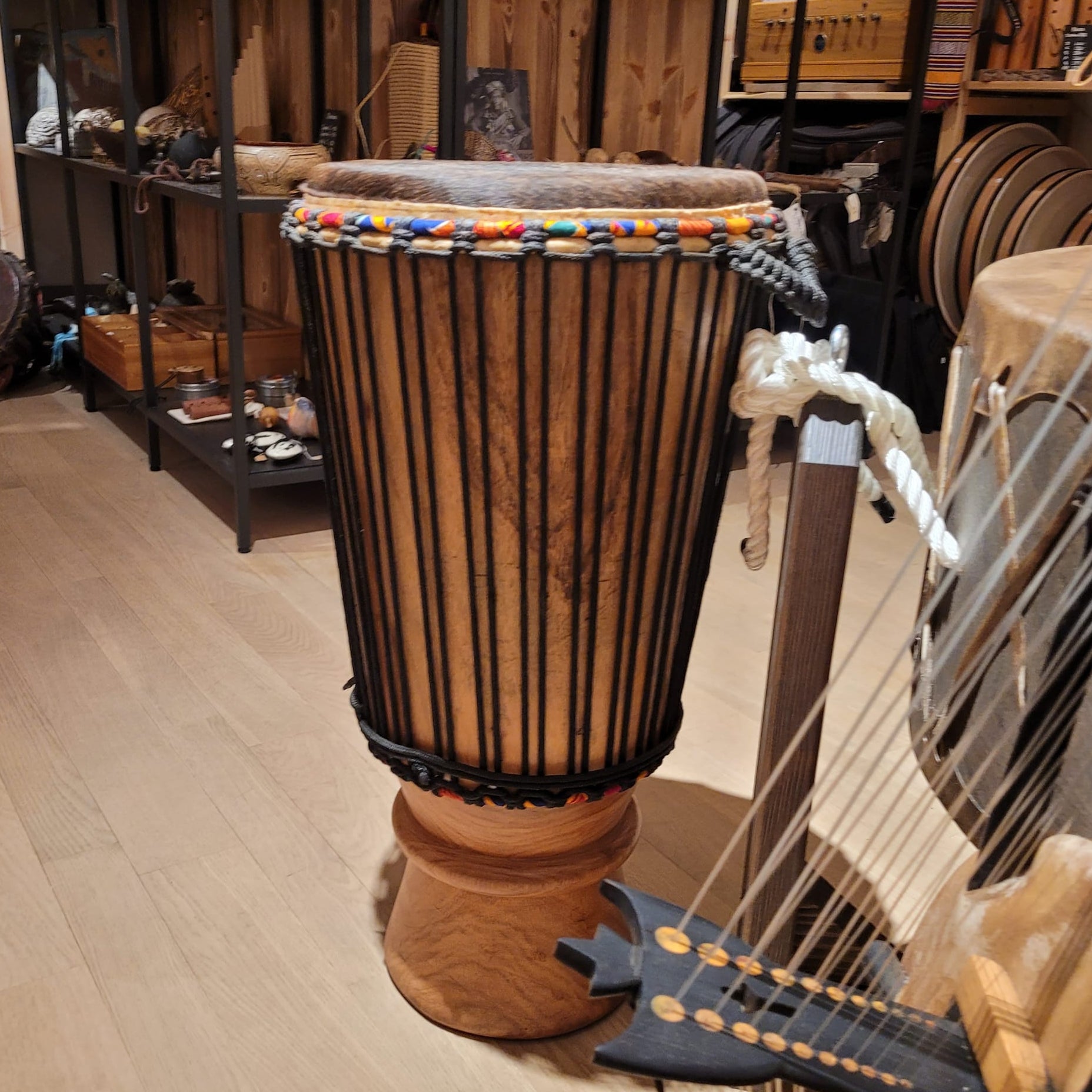 Handgefertigt aus einem einzigen Holzstamm mit natürlichem, bietet dieses Instrument eine professionell stimmbare Bespannung aus vorgestrckter Schnur. Sein Klang ist warm und voll, mit kraftvollem Bass und einem bauchigen, herzschlagähnlichen Puls. Traditionell wird es in der Casamance, Süd-Senegal, bei festlichen und rituellen Anlässen gespielt.