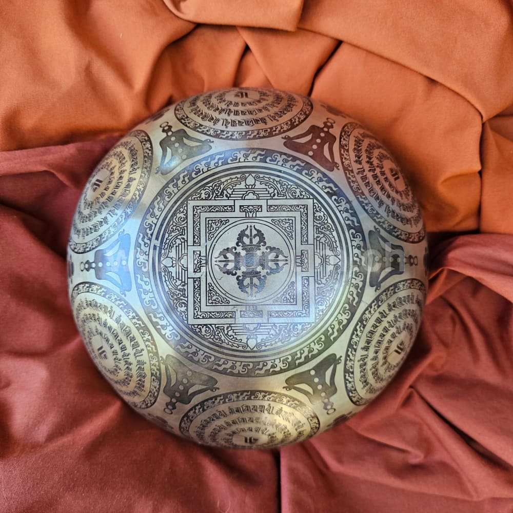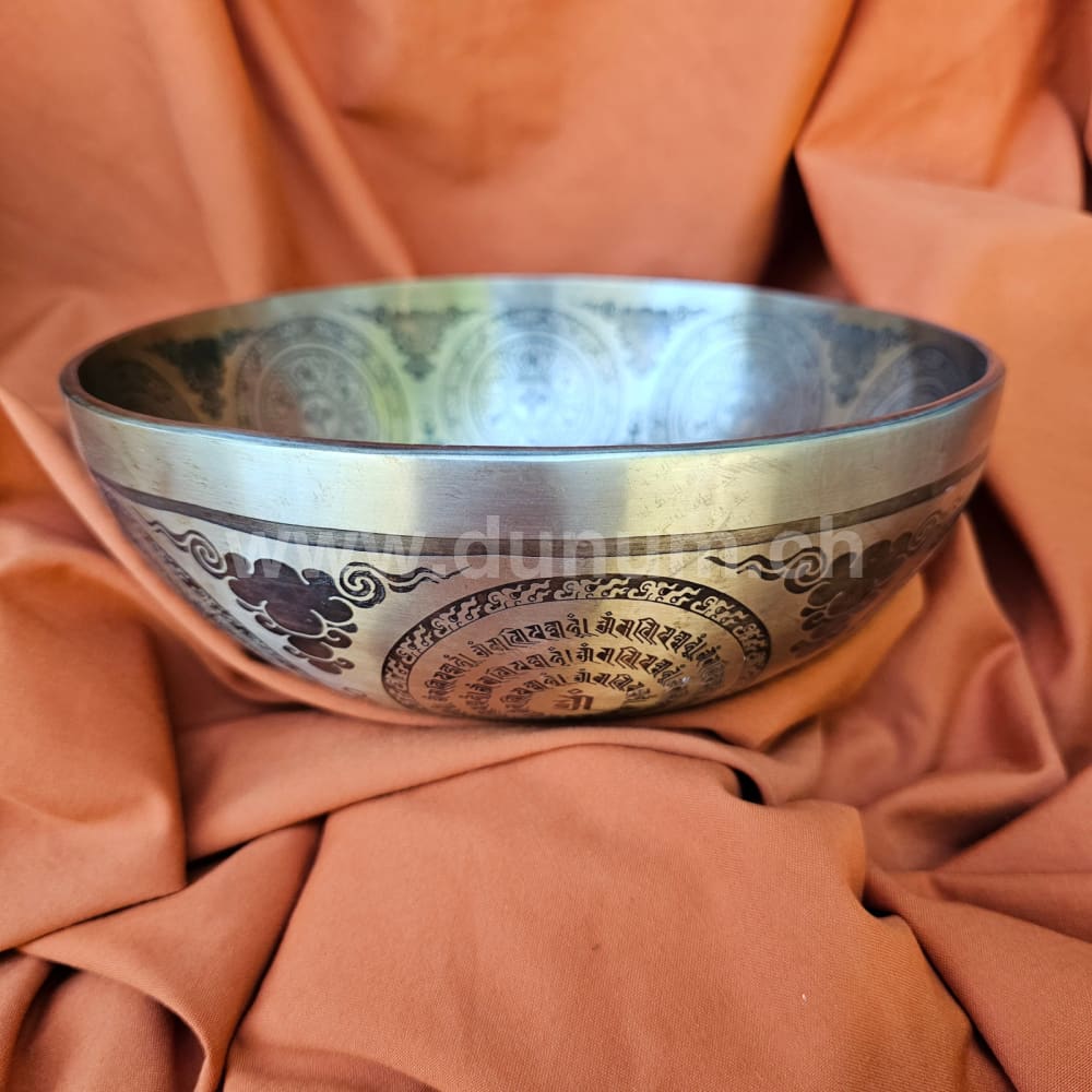 Singing bowl with lucky dragon in the center, surrounded by sacred mantra of compassion Om Mani Padme Hum and yogis. On the outer edge more Om Mani Padme Hum mantras and below the double dorje . The double dorje is the sign of the absolute, of perfection, of the divine. A symbol of the connection between man and all the points of the compass. With such a dorje you have a connection from top to bottom and simultaneously to the sides. It has an energetically opening opening effect.