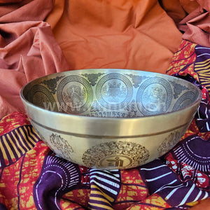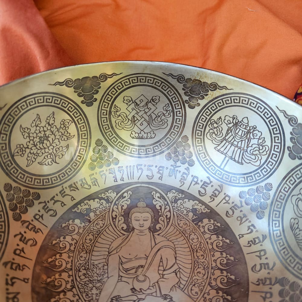 Singing bowl with ornate patterns from Nepal: A Medicine Buddha in the center.He is seated in the lotus position, holding a bowl of nectar in his left hand, his right hand forms the mudra of wish fulfillment and holds a myrobalan branch, a symbol of healing (Tibetan tradition). He is one of eight healing Buddhas, including Buddha Shakyamuni. He is encircled by the mantra: Om Mani Padme Hum - the mantra of compassion and the 8 auspicious Buddhist symbols on the inner walls. The Om Mani Padme Hum mantra is repeated on the outer walls and on the floor.