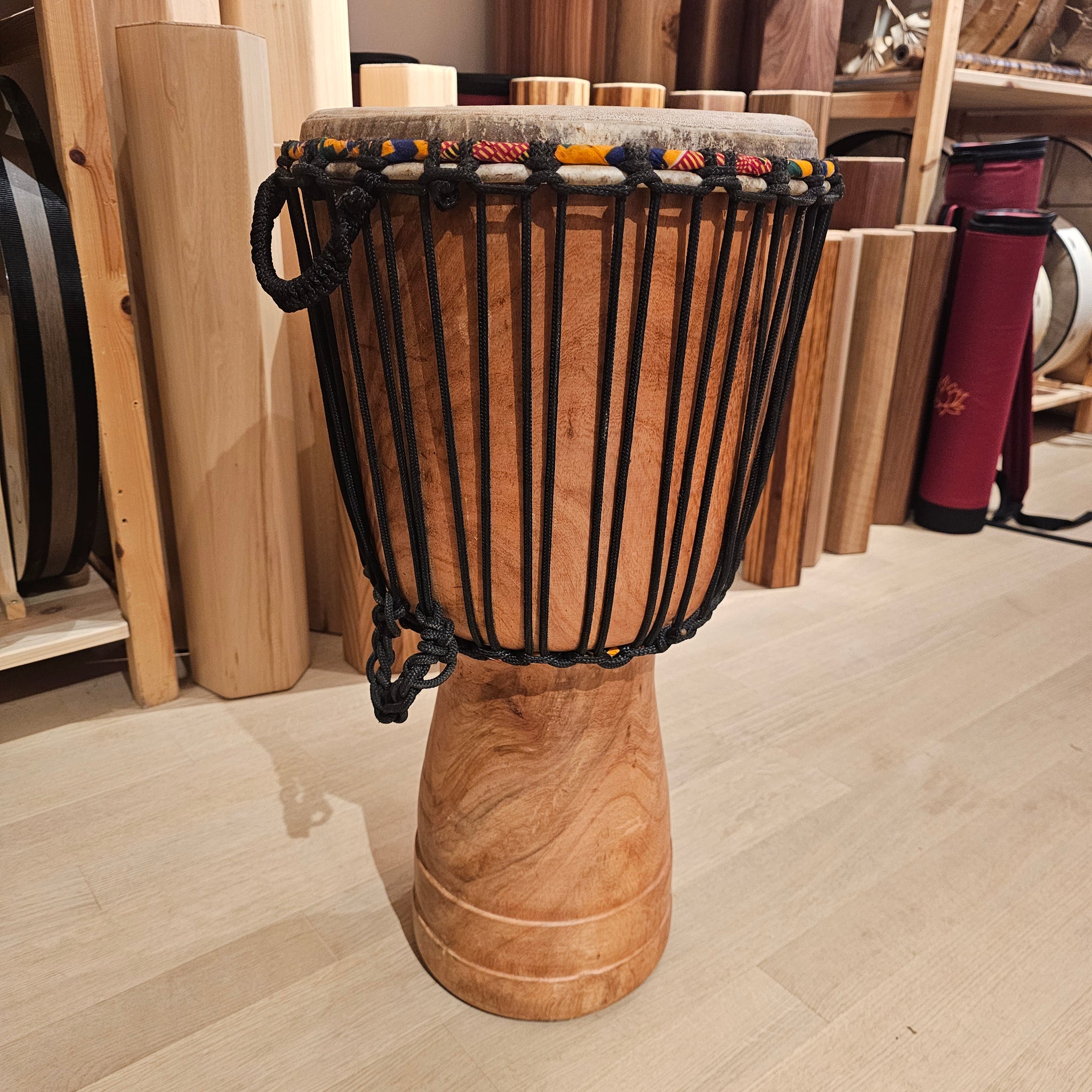 Good djembé from Ghana. Made of high-quality, hand-crafted wooden body from a single hardwood trunk, artfully decorated by hand down to the smallest detail .