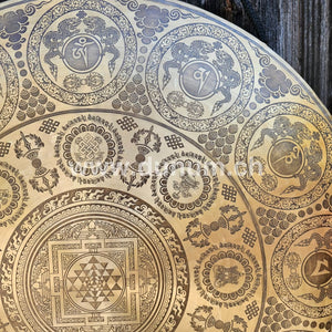 Gong magnifiquement décoré du Népal, avec un double dorje au centre entouré de mantras tibétains.
