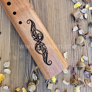 Comme les autres flûtes de la série Doppel Nova, la gravure décorative s'inspire du thème des plumes. La flûte double Nova Bass "D" a un son grave et profond qui est méditatif et régulier. Cette flûte basse est accordée dans la tonalité de "mi" mineur grave et peut également être jouée dans la gamme diatonique majeure relative dans la tonalité de "sol".