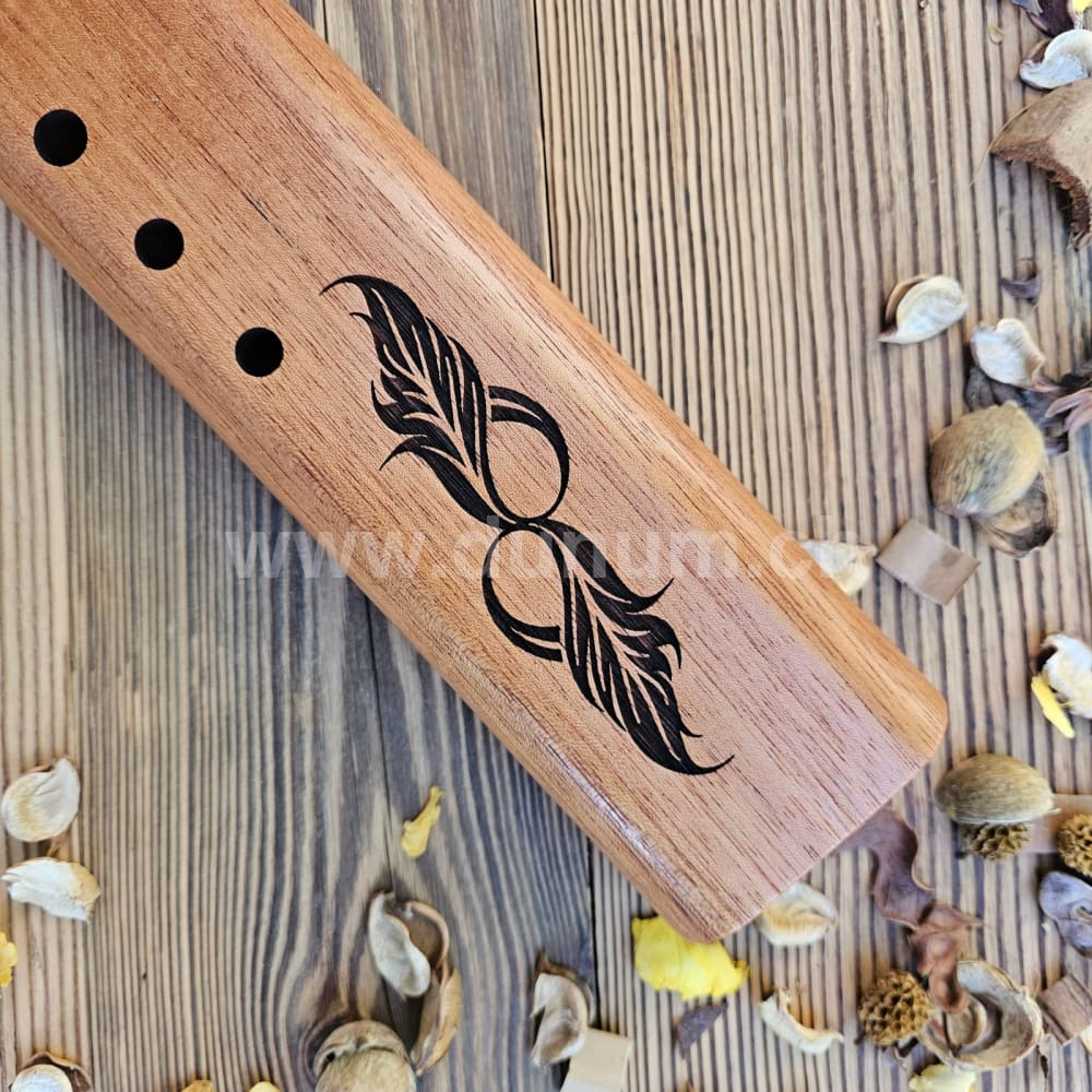 Comme les autres flûtes de la série Doppel Nova, la gravure décorative s'inspire du thème des plumes. La flûte double Nova Bass "D" a un son grave et profond qui est méditatif et régulier. Cette flûte basse est accordée dans la tonalité de "mi" mineur grave et peut également être jouée dans la gamme diatonique majeure relative dans la tonalité de "sol".