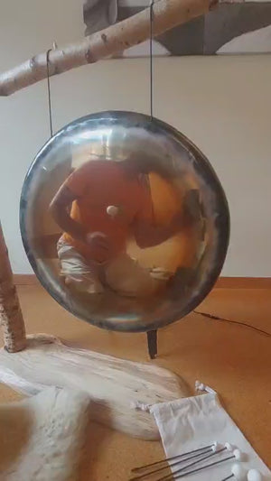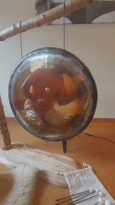 Fabriqué en maillechort de qualité supérieure, le gong produit un son profond et harmonieux qui met le corps et l'esprit en harmonie. Sa forme ovale lui confère une dynamique sonore particulière avec des vibrations finement graduées et une longue réverbération flottante.