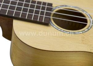 Ukulélé Concert, corps en bambou, manche en acajou, touche & chevalet en noyer, 18 frettes, sillet & chevalet en nubone, cordes en nylon Aquila, frettes rw ABS, finition naturelle mate à pores ouverts, mécaniques de guitare ouvertes noires/chromées avec ailes noires, longueur 375 mm, largeur de sillet 38 mm.