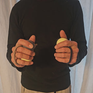 On tient une boule dans la main pendant que l'autre est suspendue à la ficelle.