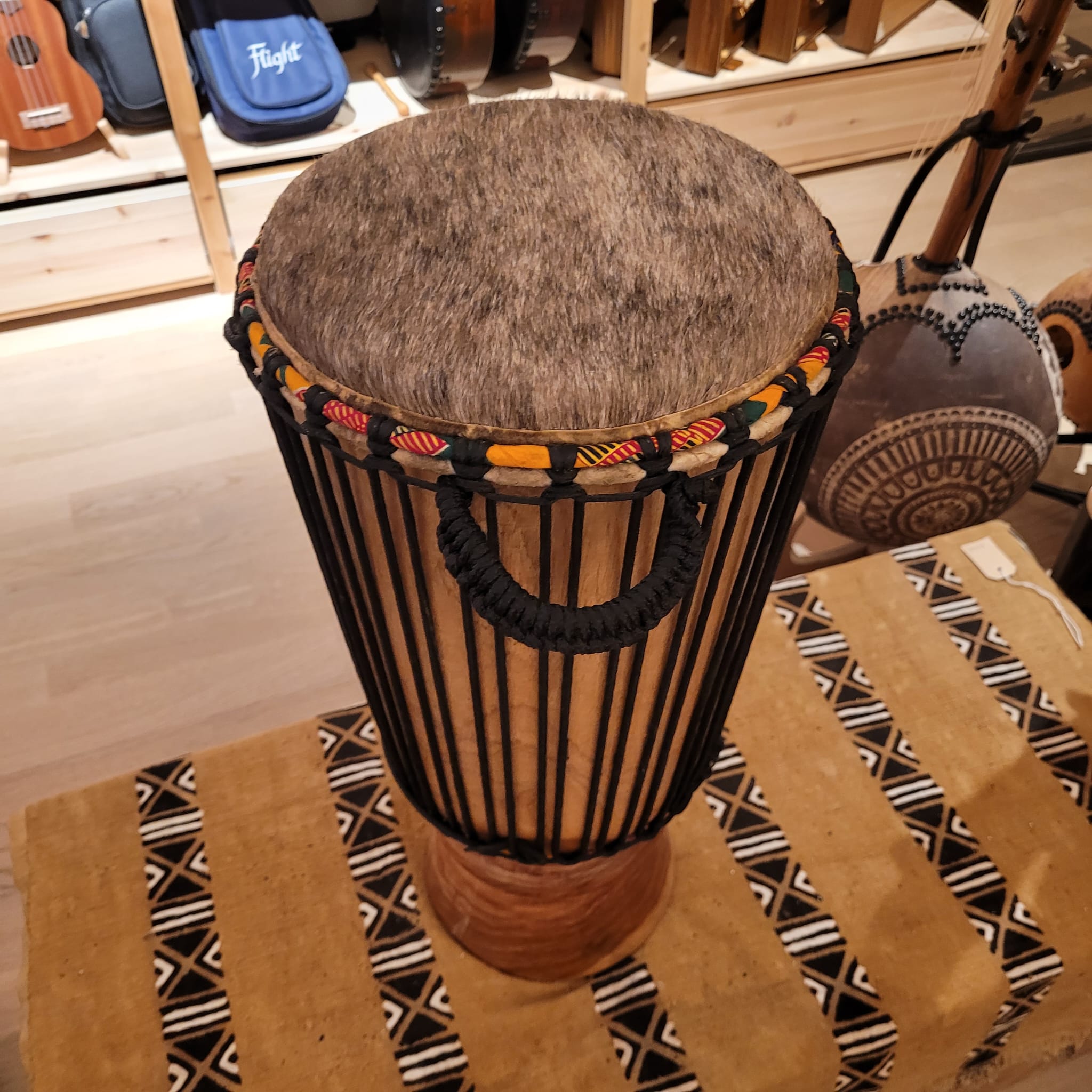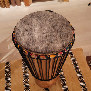 Handgefertigt aus einem einzigen Holzstamm mit natürlichem, bietet dieses Instrument eine professionell stimmbare Bespannung aus vorgestreckter Schnur. Sein Klang ist warm und voll und überzeugt durch seinen klaren, herzschlagähnlichen Puls. Traditionell wird es in der Casamance, Süd-Senegal, bei festlichen und rituellen Anlässen gespielt.