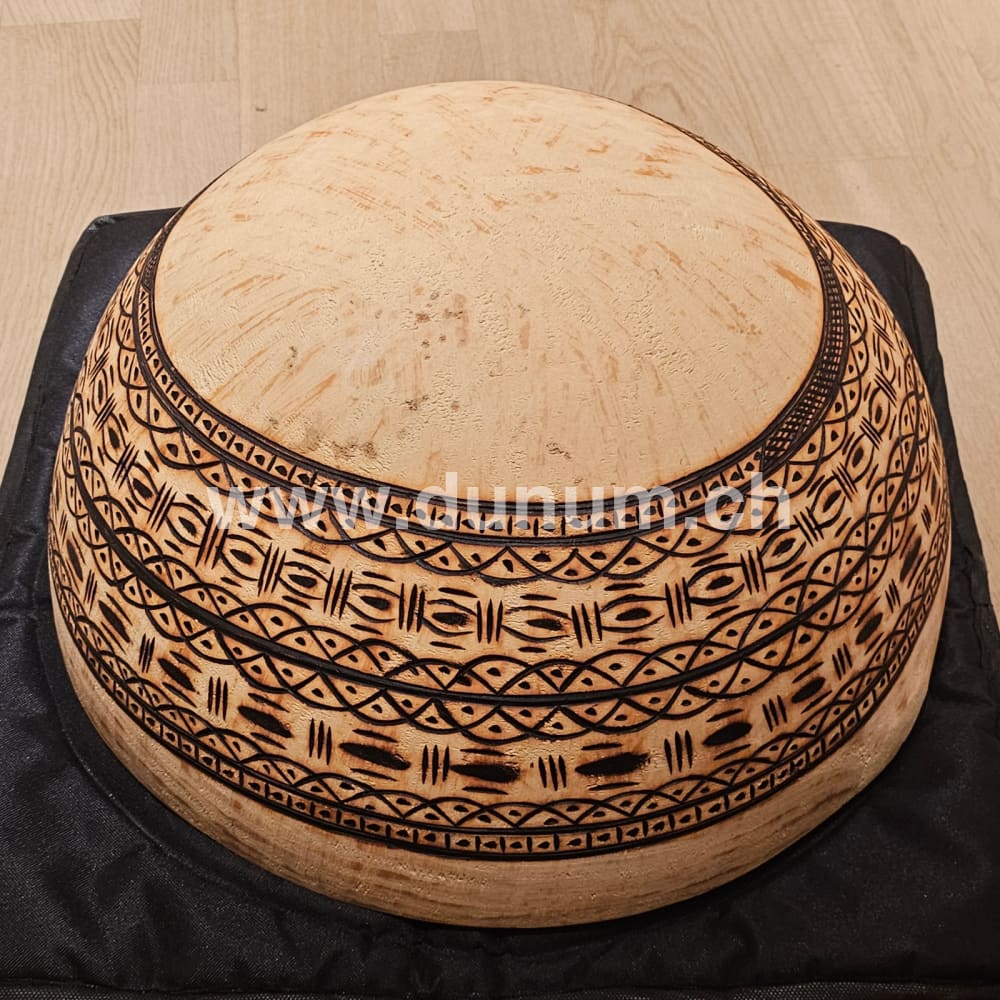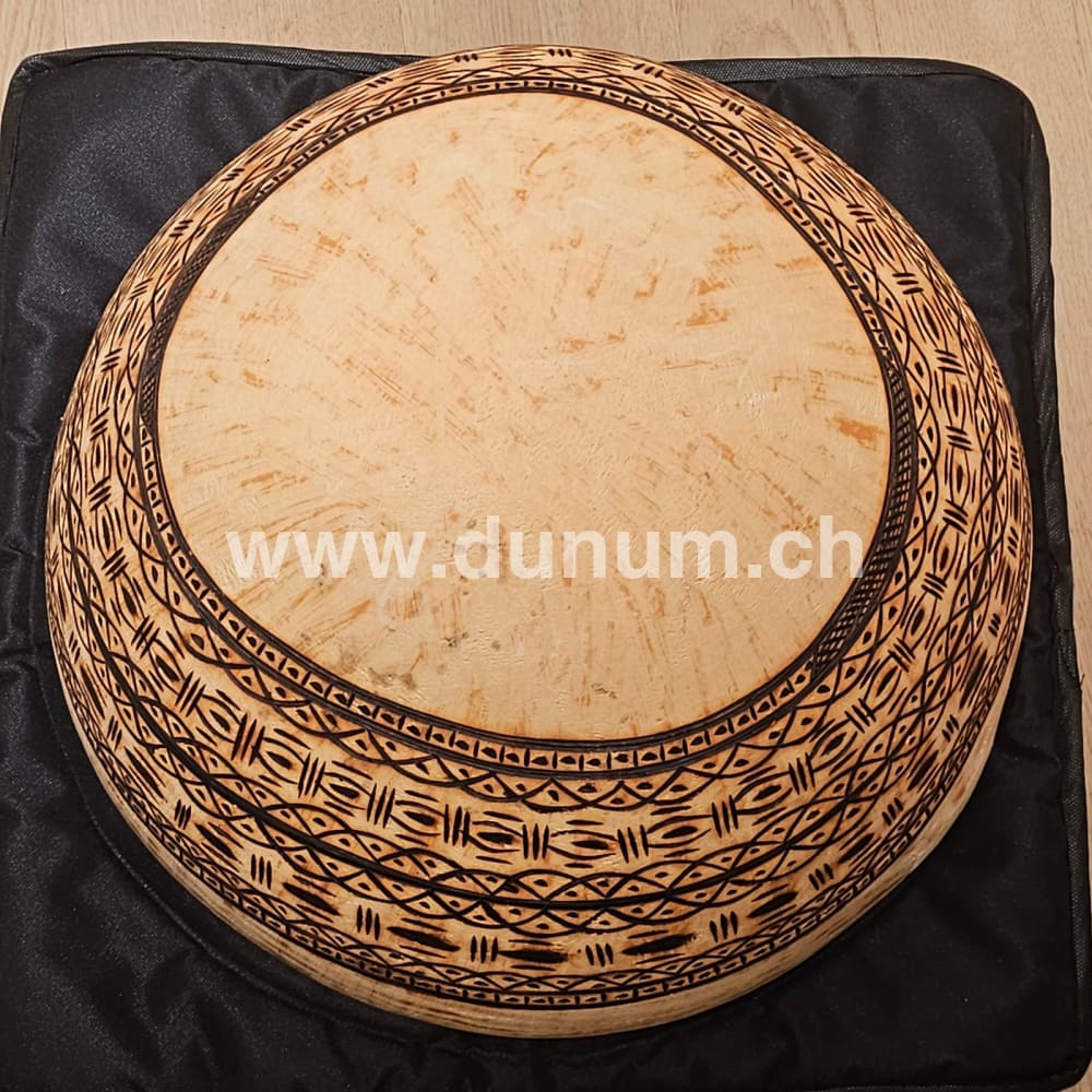 Cette calebasse du Niger est particulièrement épaisse. Elle résiste à des coups répétés à la main seule, avec un anneau ou un bâton. Le bord est plat pour qu'elle soit très stable lorsqu'elle est posée et pour obtenir le meilleur son.