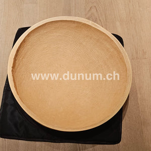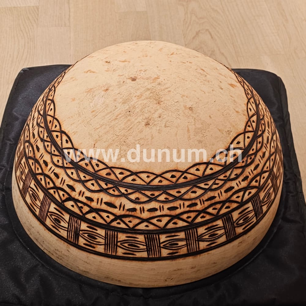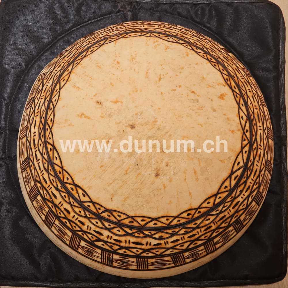 Cette calebasse du Niger est particulièrement épaisse. Elle résiste à des coups répétés à la main seule, avec un anneau ou un bâton. Le bord est plat pour qu'elle soit très stable lorsqu'elle est posée et pour obtenir le meilleur son.