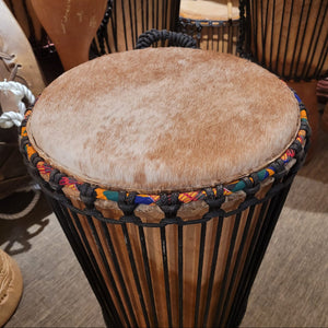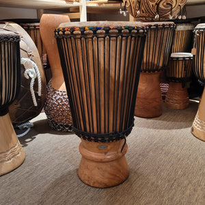 Handgefertigt aus einem einzigen Holzstamm mit natürlichem, bietet dieses Instrument eine professionell stimmbare Bespannung aus vorgestrckter Schnur. Sein Klang ist warm und voll, mit kraftvollem Bass und einem bauchigen, herzschlagähnlichen Puls. Traditionell wird es in der Casamance, Süd-Senegal, bei festlichen und rituellen Anlässen gespielt.