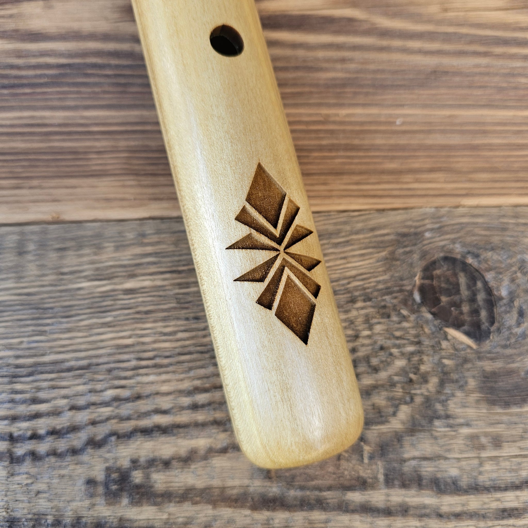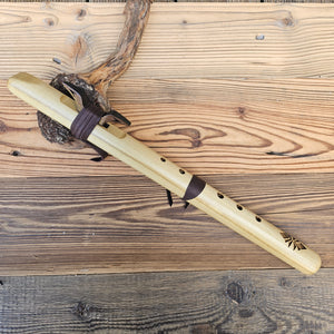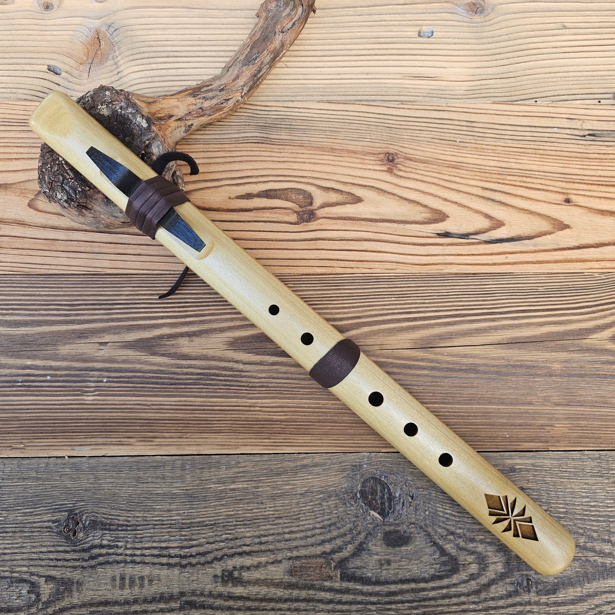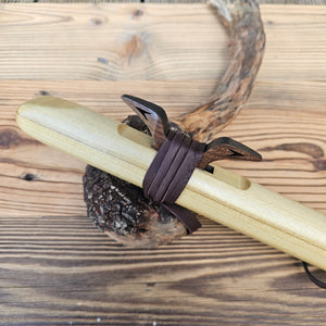 Wenn dieses dritte Loch von oben abgedeckt wird, ist die Flöte leichter zu erlernen. Die Lederabdeckung kann einfach gelöst und entfernt werden, sodass der Spieler die Wahl hat, das Instrument entweder als Fünfloch- oder als Sechsloch-Flöte zu spielen.