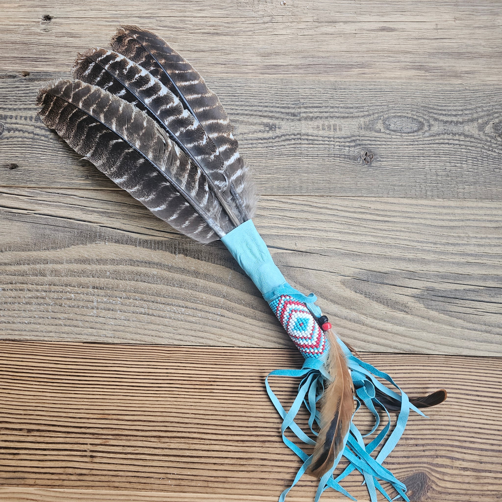 Der Fächer entsteht in sorgfältiger Handarbeit eines Navajo‑Künstlers. Der mit Leder umwickelte Griff ist kunstvoll mit Fell, Perlen und langen Fransen geschmückt; die Federn tragen bemalte Muster entlang des Schafts. Jedes Stück ist ein Unikat, das den persönlichen, heiligen Pfad des Künstlers widerspiegelt. Ein Echtheitszertifikat liegt bei.